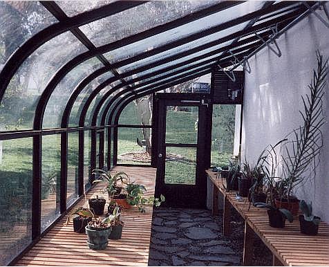 A greenhouse structure which depends on its attachment to another building for much of its support. A lean-to greenhouse appears as a free-standing greenhouse bisected in half along its longitudinal centerline with the missing side provided by the building against which it is supported. Glass is typically used as the greenhouse covering. Overall construction costs are lower relative to stand-alone glass greenhouses (A-frame, pillar and rafter).